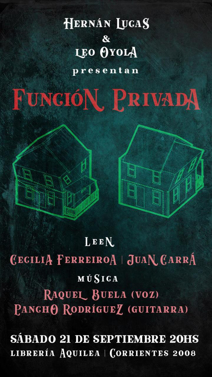 Raquel Buela (voz) y Pancho Rodríguez (guitarra) musicalizaron el corto “Una semana” de Buster Keaton en el marco de una edición especial del Ciclo Función Privada, organizado por los escritores Leonardo Oyola y Hernán Lucas, el sábado 21 de septiembre de 2019 en la Librería Aquilea (Av. Corrientes 2008, CABA). Así lo reseñó Raquel: “Función Privada: floreció en Primavera y a sala llena. En Librería Aquilea, se concretó la edición especial del Ciclo Función Privada, organizado por los escritores Leonardo Oyola y Hernán Lucas, grandes anfitriones de una velada única. A la luz de las velas, disfrutamos de los textos de Cecilia Ferreiroa y Juan Carrá. Junto a Pancho Rodríguez musicalizamos el corto ‘Una semana’, de Buster Keaton. Inolvidable experiencia. Gracias por invitarnos. Gracias a todos los que concurrieron y nos acompañaron con su canto en el fin de fiesta”.